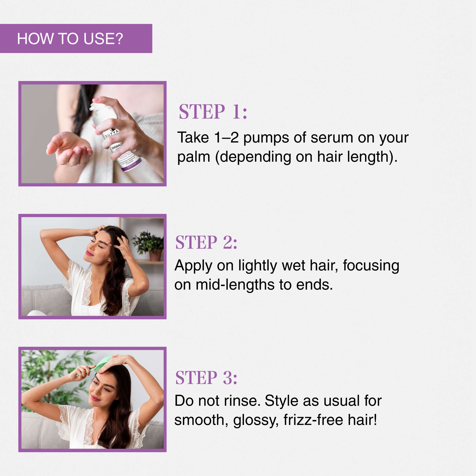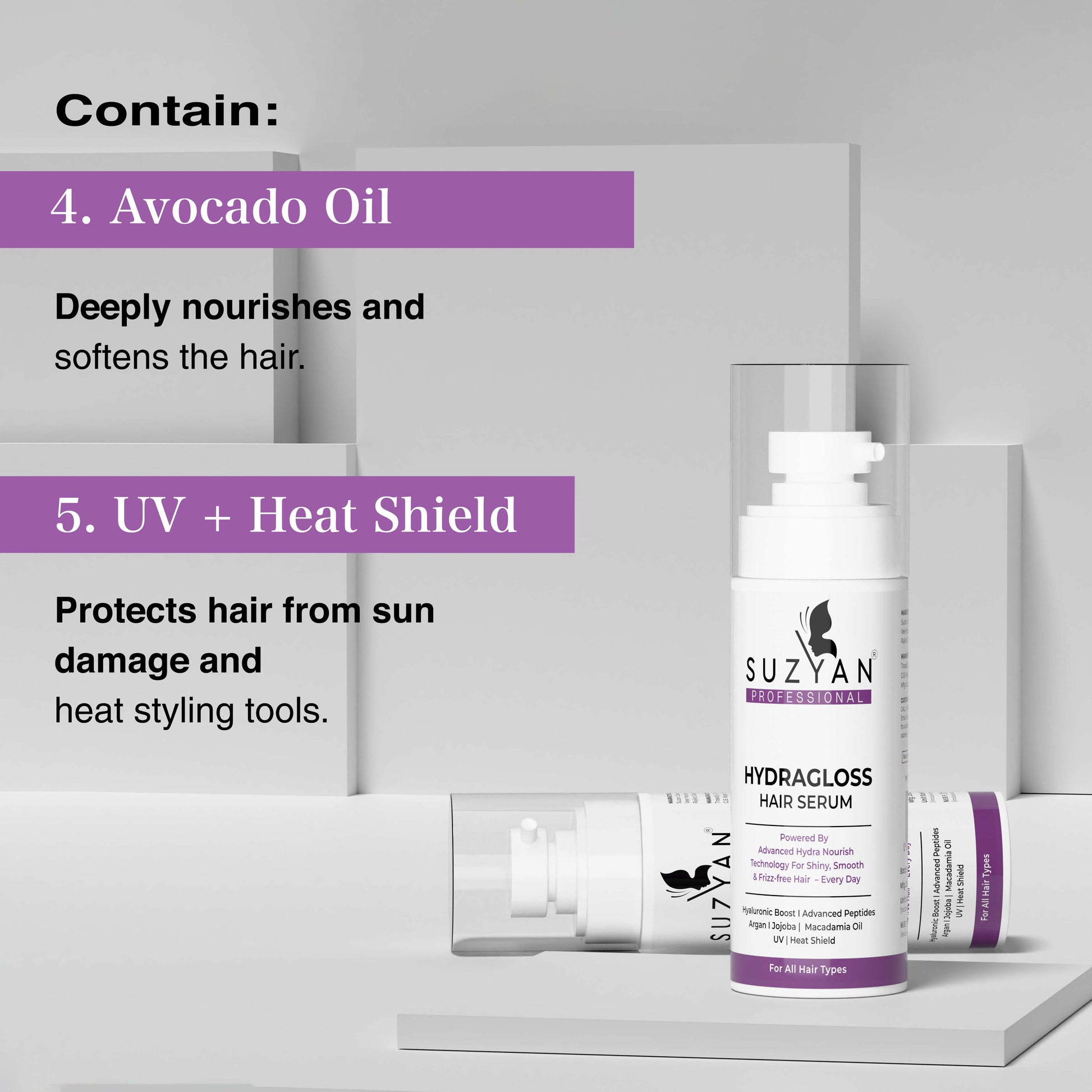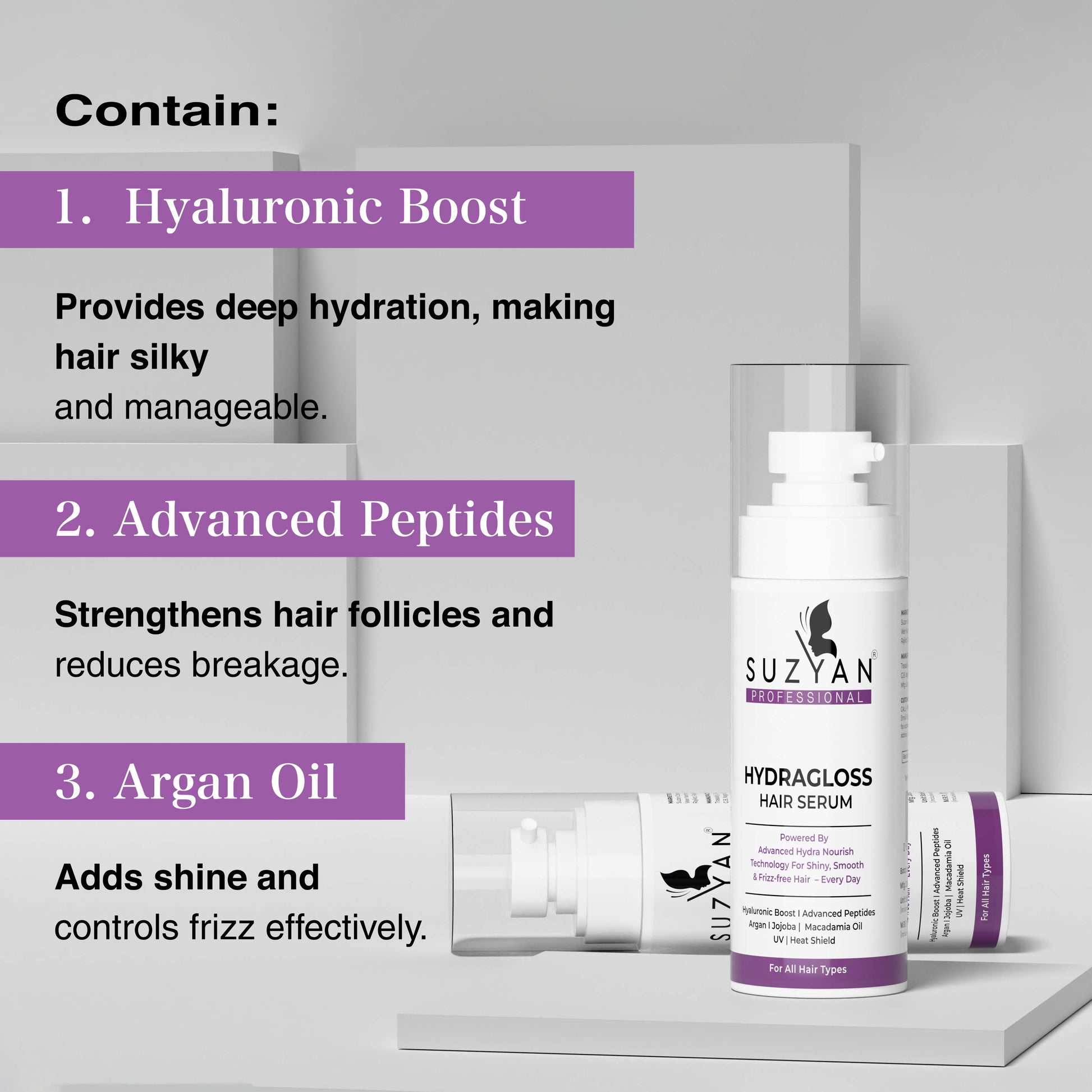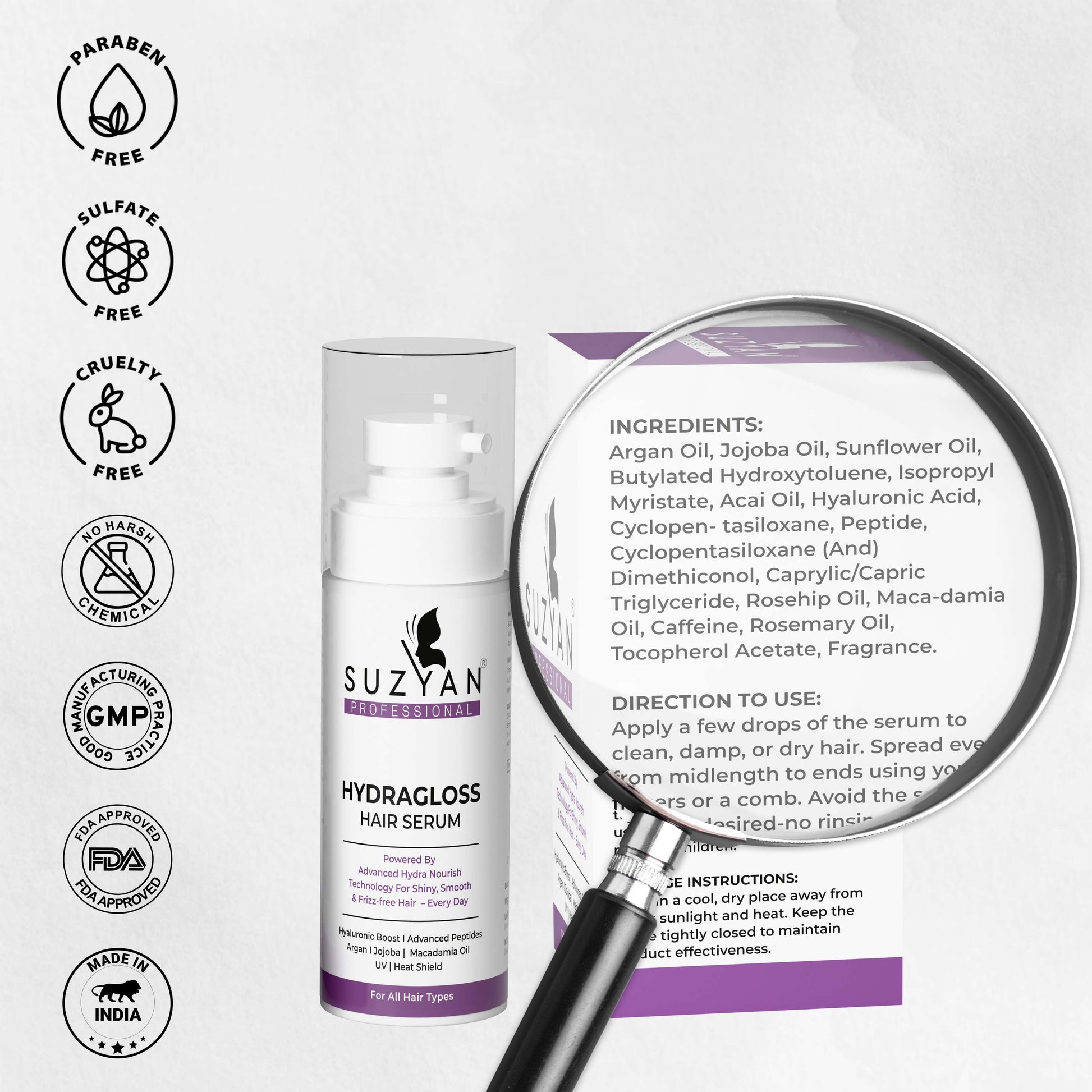 Suzyan Hydragloss Hair Serum with Argan Oil & Vitamin E | Boosts Shine | Controls Frizz | Lightweight Non-Sticky Formula | All Hair Types | 50ml